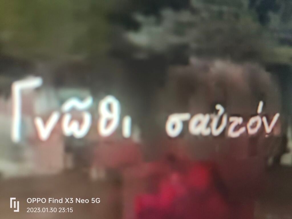 Esto que ven abajo está escrito en griego clásico y estaba esculpido en el frontispicio de un templo en la ciudad de Delphi, el onfalo del mundo griego.